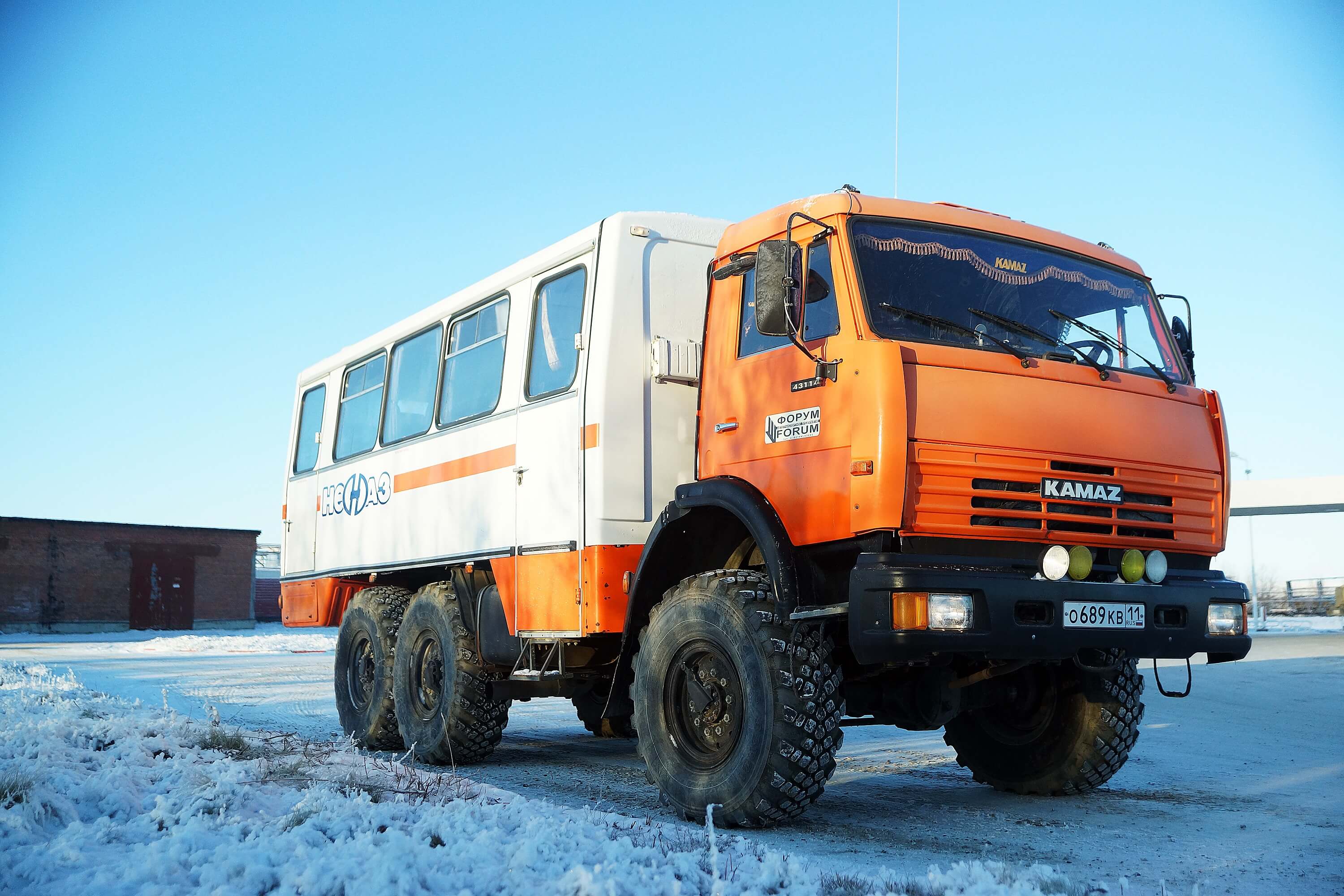 Вахтовый автобус КАМАЗ оборудован кузовом-фургоном и предназначен для всесезонной оперативной доставки рабочих (ремонтных, строительных, геолого-разведывательных и т.п.) бригад на объект по любой категории дорог.